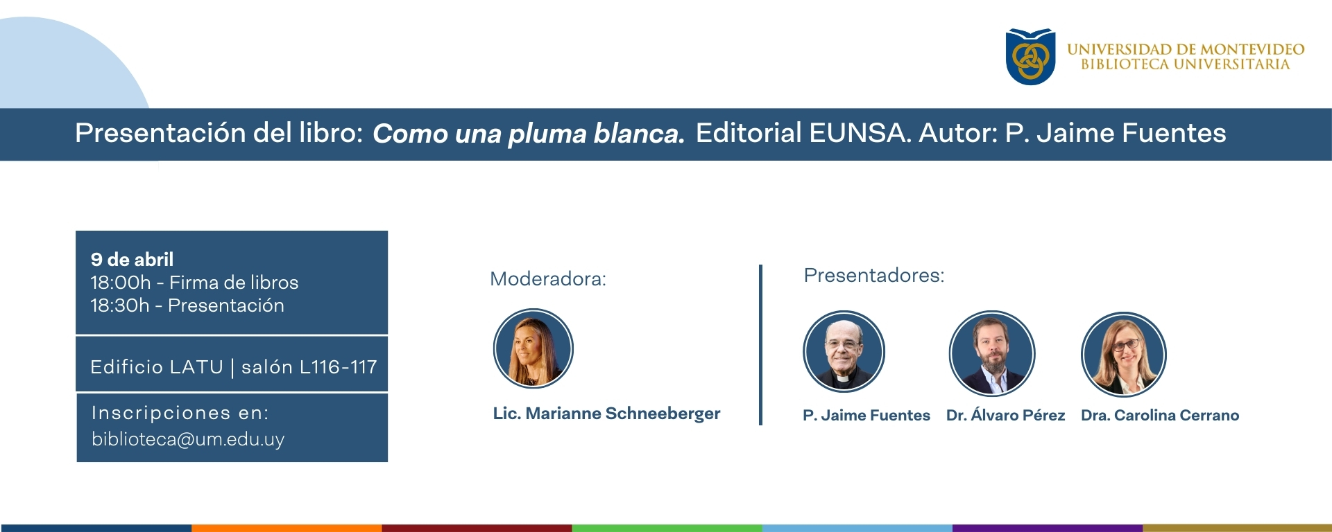 Presentación del libro: Como una pluma blanca. Editorial EUNSA. Autor: P. Jaime FuentesMié, 09/04/2025 - 18:00 El P. Jaime Fuentes presenta libro en la Biblioteca Universitaria