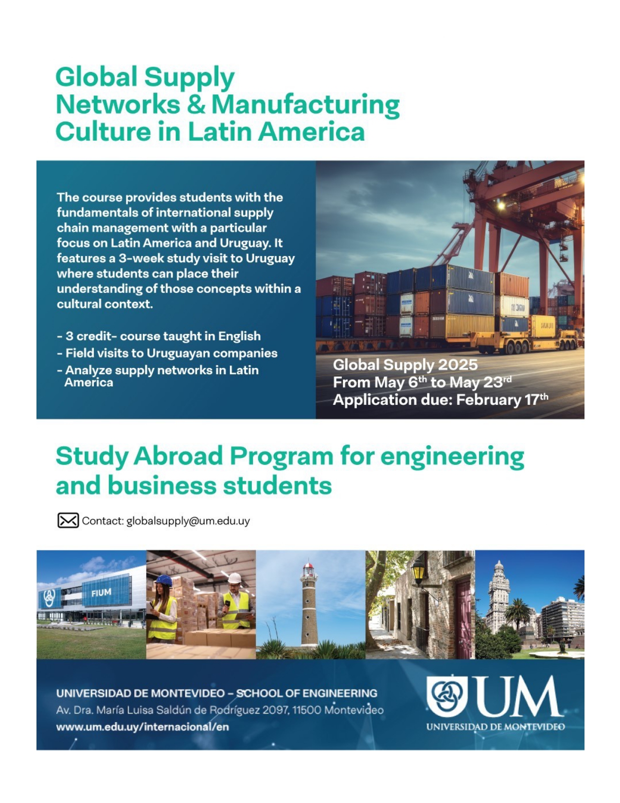 Global Supply Networks & Manufacturing Culture in Latin America (GSP) is a three-week study Program designed for business and engineering students in their third or fourth year of study. It focuses on providing students with the fundamentals of international supply chain methods with a special focus on Latin America and Uruguay.