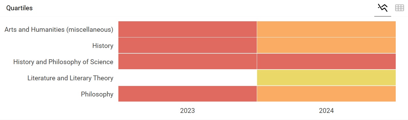 Ingresada en la base de datos Scopus en 2023, la revista ha logrado en un corto período posicionarse favorablemente dentro de los estándares de visibilidad e impacto académico internacional. Las métricas del Q2 fueron alcanzadas por el área de Literatura y teoría literaria, mientras que las áreas de Historia, Filosofía y Arte subieron al Q3. Este ascenso en el indicador refleja el esfuerzo dedicado al cumplimiento de los criterios de calidad de las publicaciones científicas, alineados con las disposiciones de los sistemas regionales de información como Latindex, el portal Scielo, DOAJ (Directory of Open Access Journals) y las bases de datos como Scopus y Web of Science.