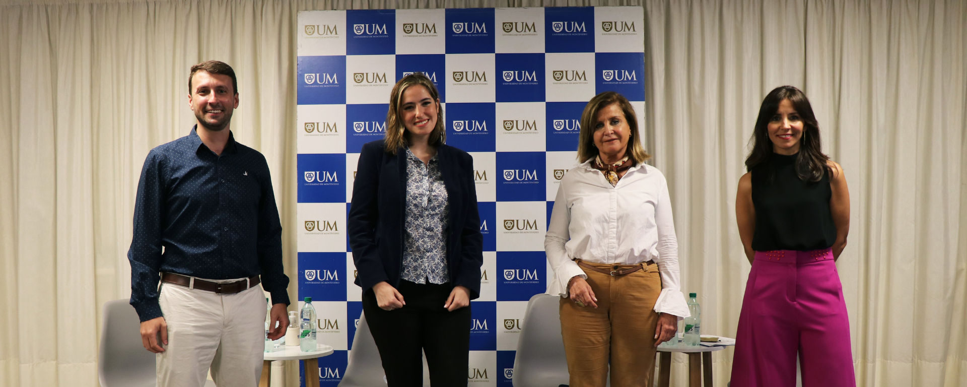 Un hombre y tres mujeres (panelistas del encuentro) miran a cámara. Se ecuentran en el salón de la actividad, detrás de ellos hay un panel con el logo de la UM.