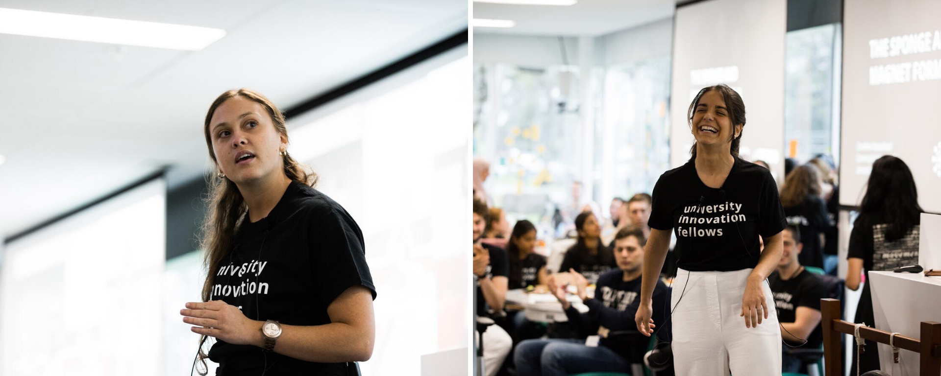 La primera generación de estudiantes de la UM que participó del meetup internacional anual University Innovation Fellows voló a EEUU en 2017. A partir de ese momento, cada año viajan a este evento algunos alumnos de diferentes facultades. Luego del encuentro, la universidad elige a algunos de los participantes para volver como fabs (por “fabulous”) y encargarse de la coordinación de la actividad. La primera representante de la UM en asistir como fab fue Romina Dominzain. Este año, fue el turno de Lucía Rodríguez (la de la foto de la izquierda) y Carolina Vassalucci. Carolina estudia Comunicación. Lucía, Contador Público y Dirección y Administración de Empresas.