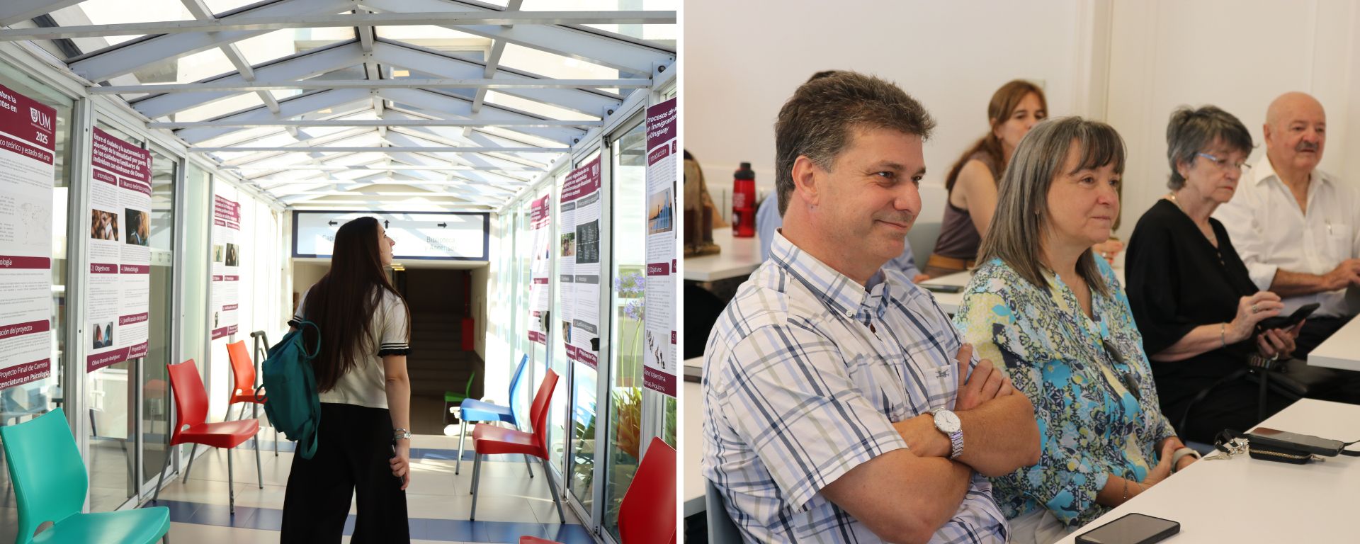 Durante el último año y medio los alumnos fueron preparando su proyecto final de carrera, una propuesta de investigación en un tema de su elección. Lo hicieron de modo individual o en duplas, mientras cursaban las demás materias de la currícula. El viernes 12 fue la fecha de exposiciones orales ante los tribunales (funcionaron dos en simultáneo), que estaban compuestos por un miembro de la Facultad y una de las docentes de la materia del proyecto: Natalia Penas en un aula y María Emilia Oñate en la otra. Cada grupo tenía 10 minutos para hacer su exposición y podía traer invitados, que después de la instancia se quedaban para acompañar en el jardín con un desayuno.
