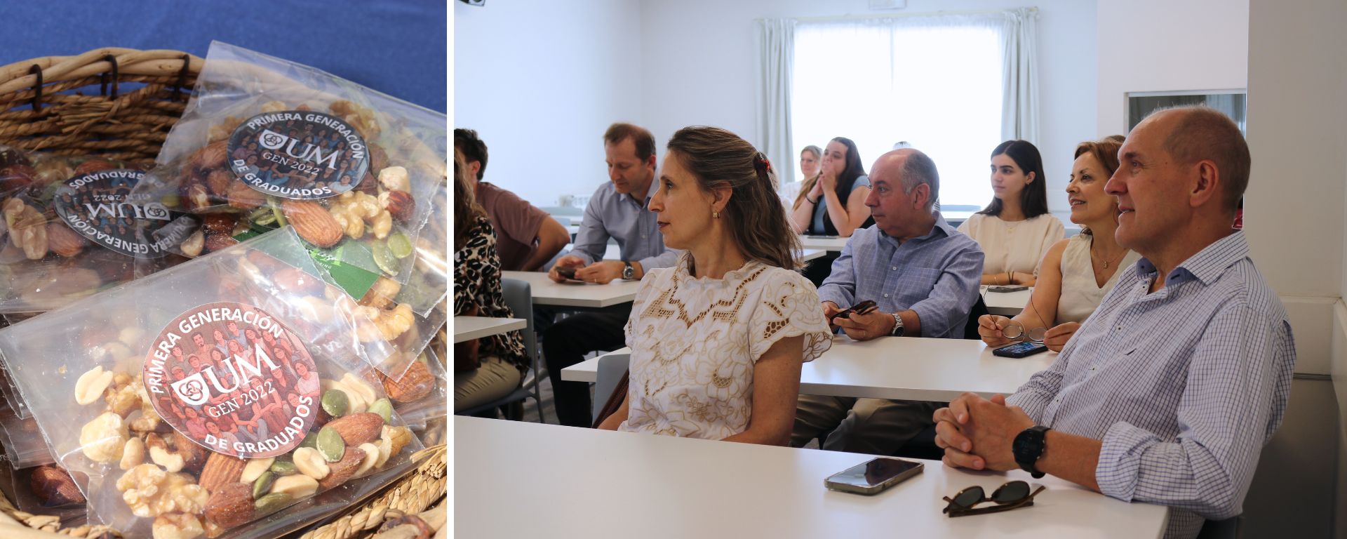 Una vez que terminaron todas las presentaciones orales, el equipo docente de la Facultad reunió a todos los presentes -estudiantes, amigos, padres, abuelos, sobrinos, hermanos, novios…- en el patio. La decana, María José Soler, habló de la metáfora del árbol, y dijo que los chicos eran en cierta medida un árbol, con sus buenas raíces y su historia, que había crecido en los últimos cuatro años en la UM. Ahora es tiempo de cobijar pájaros, de ser refugio para quienes quieran volar, invitó. Mónica Larrosa, coordinadora de la Licenciatura, recordó las entrevistas de los primeros interesados en cursar una carrera que aún no existía, y agradeció la confianza de esta primera generación. “Queremos que sean buenos profesionales, pero sobre todo, buenas personas”, aseguró.